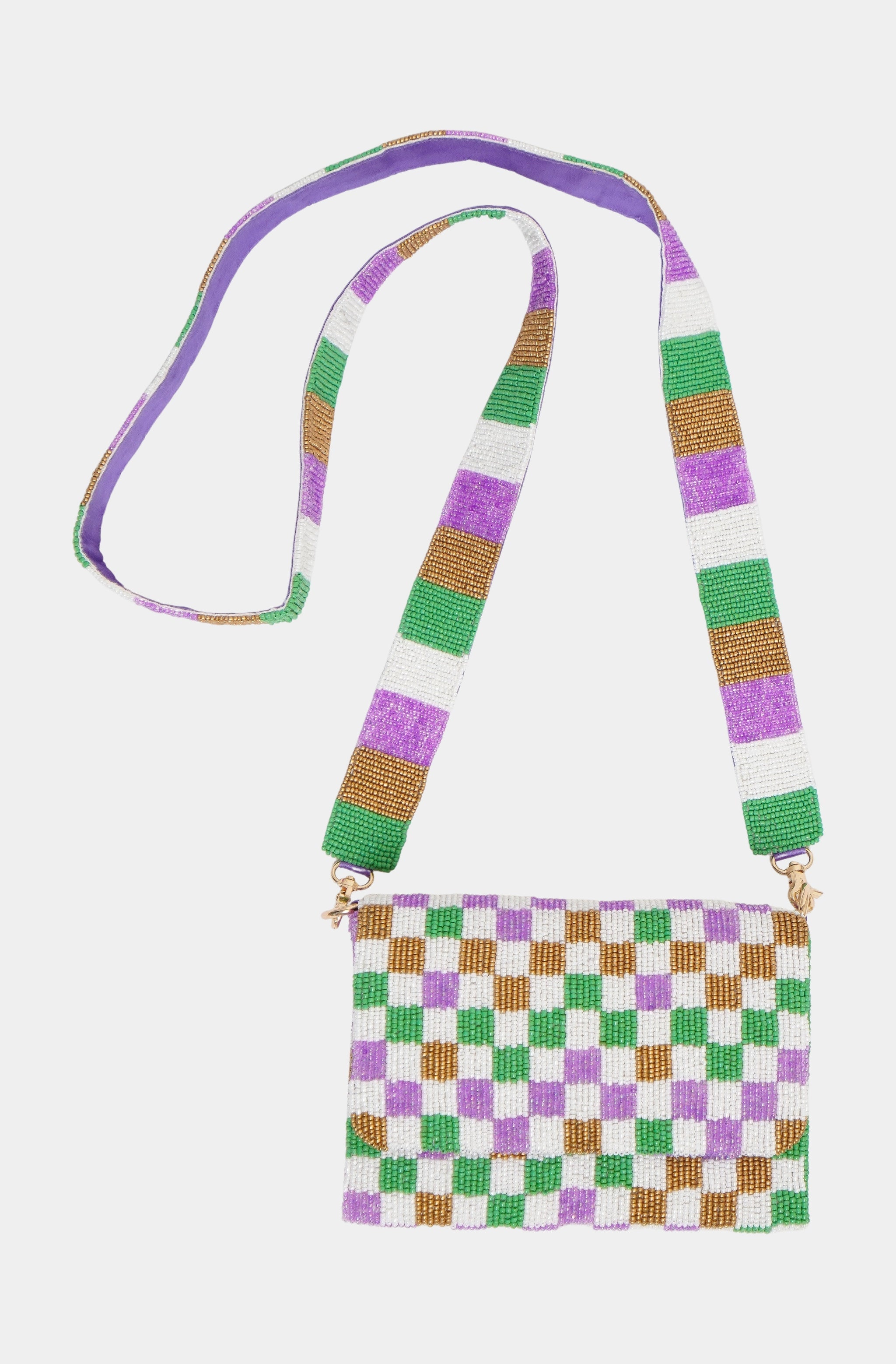 Hemline Exclusive Mardi Gras Checkered Crossbody Beaded Bag w/ Strap