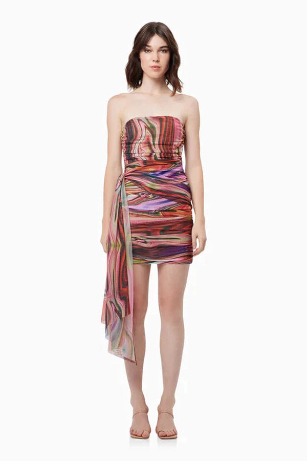 Multicolor abstract print mesh (95% Polyester, 5% Spandex). Sheath. Strapless. Back zipper closure. 23.5" from shoulder to hemline. Imported.